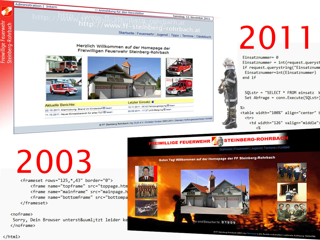 Geschrieben von Christian GruberVor 20 Jahren ging die Freiwillige Feuerwehr Steinberg-Rohrbach online. Als einer der ersten Wehren im Bezirk informierte man auf der Homepage über Einsätze, Übungen und Veranstaltungen. Technisch gesehen hat sich inzwischen im Hintergrund viel verändert. Von einer statischen html-Seite hin zu einer datenbankbasierenden dynamischen Homepage. Für die Umsetzung der damaligen Idee, Programmierung und Berichterfassung ist seit Beginn Christian Gruber verantwortlich.