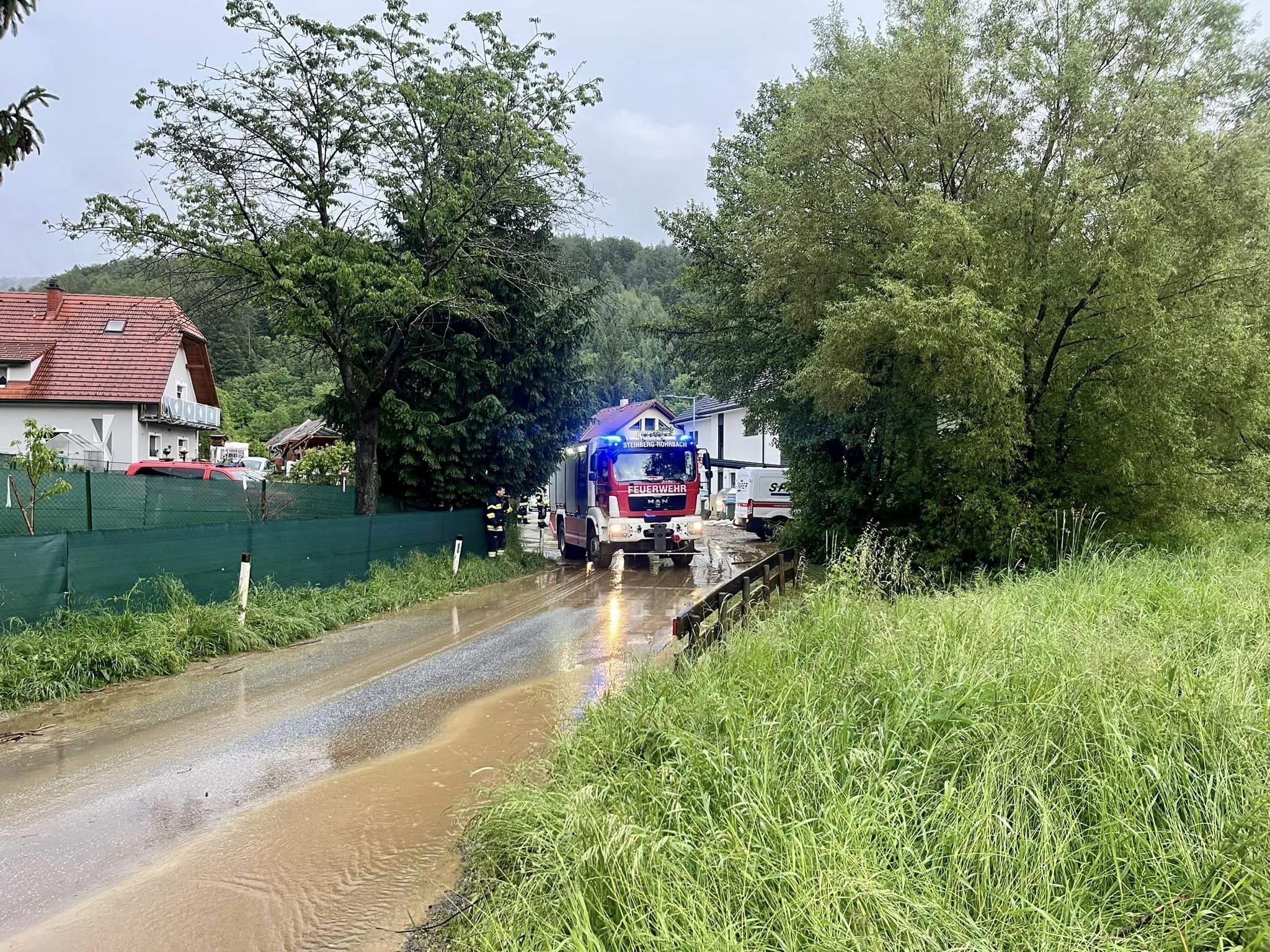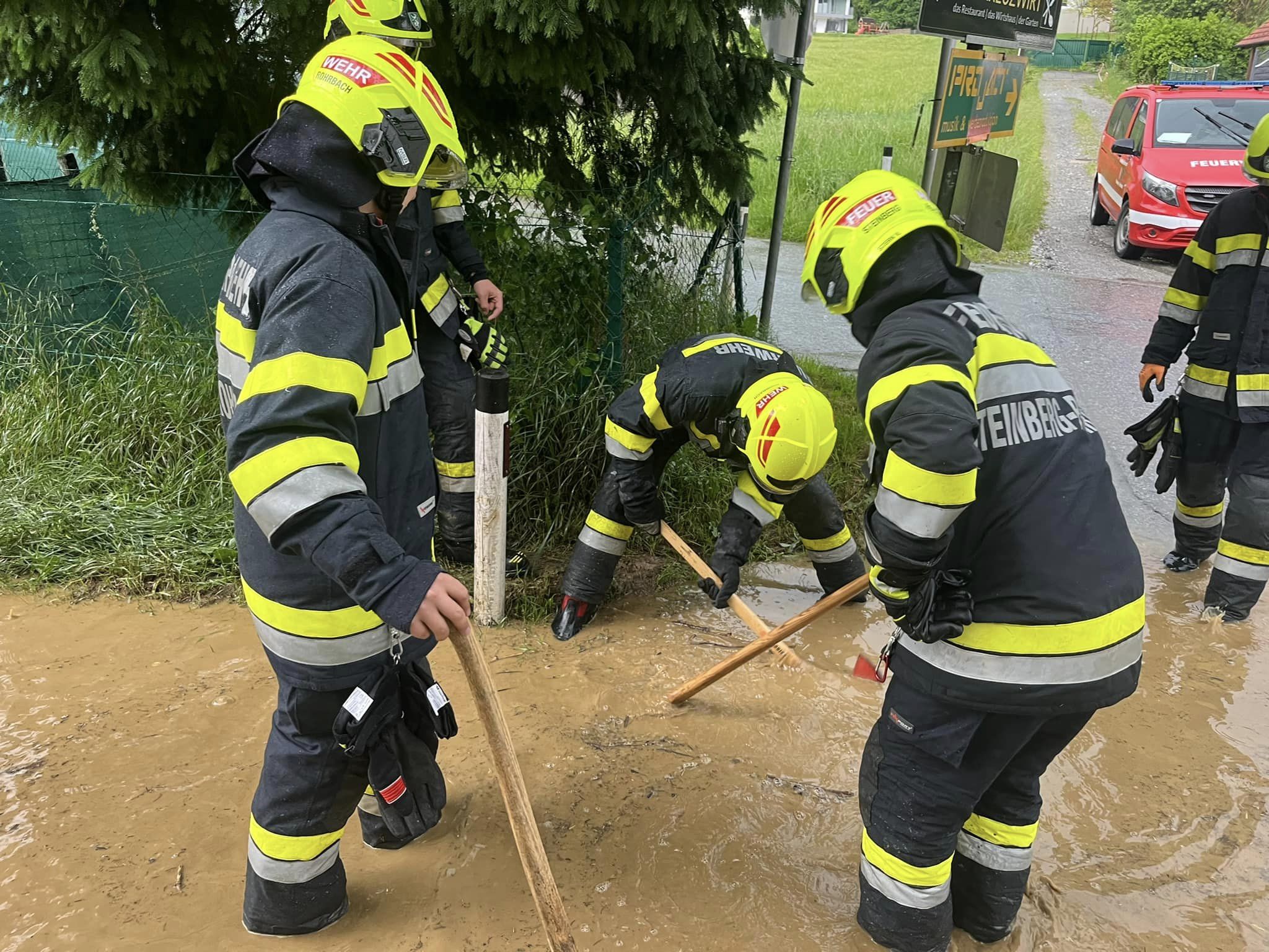 Die Einsatzkräfte der Feuerwehr konnten mit Unterstützung der Marktgemeinde Thal die Einsatzadressen abarbeiten und somit Gefahrenbereiche mindern. So wurden in besonders gefährdeten Gefahrenzonen bei Wohnhäusern und in Siedlungsgebieten gefüllte Sandsäcke in Stellung gebracht um weitere Überflutungen zu vermeiden. Um 21:30 Uhr rückte die FF Steinberg-Rohrbach wieder in das Rüsthaus ein und konnte die Einsatzbereitschaft herstellen. Gut zweieinhalb Stunden später um 23:53 Uhr gab es dann eine weitere Einsatzalarmierung. In der Tiefenbachstraße in Thal ist ein Baum über die Straße gefallen und blockierte diese. Der Baum konnte in kurzer Zeit entfernt und die Freigabe für den Verkehr sichergestellt werden.