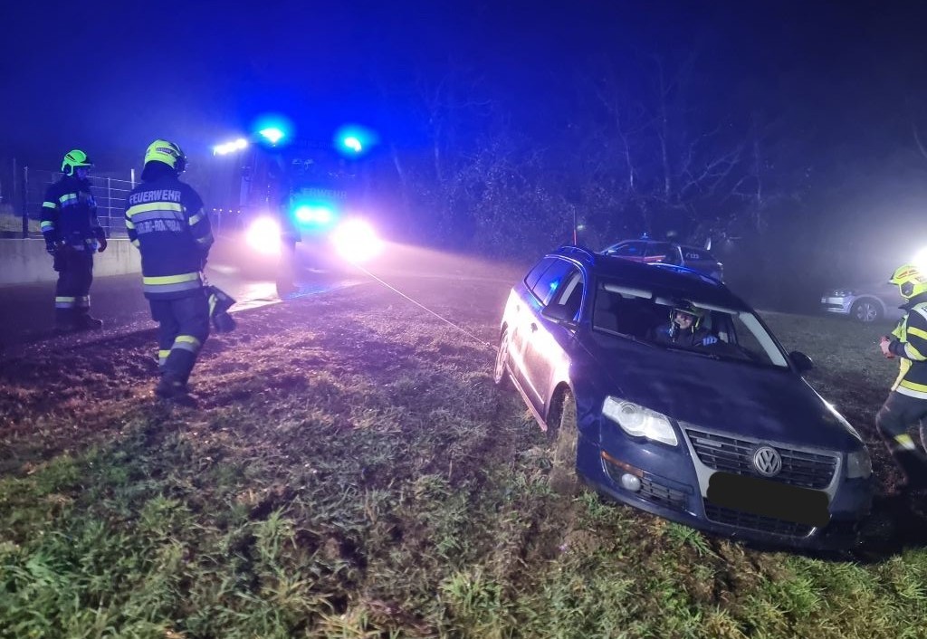 Aus ungeklärter Ursache kam ein PKW, nahe der L301 in einer Siedlung, in einer Wiese zu stehen und blieb aufgrund des weichen Untergrunds darin stecken.
