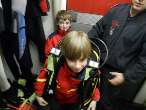 Sämtliche Ausrüstungsgegenstände und Fahrzeuge wurden den technikbegeisterten Jugendlichen nähergebracht. Ein Highlight für die 13 Besucher war eine 30 Meter hohe, luftige Ausfahrt mit der Drehleiter.