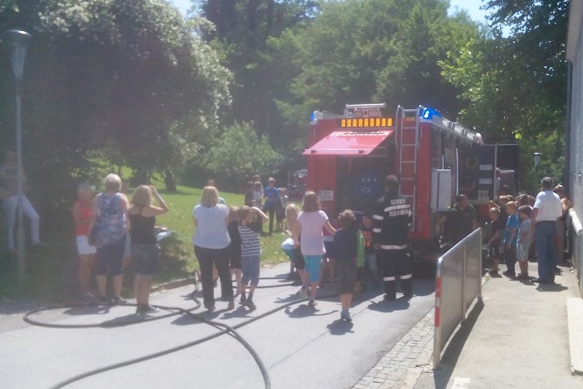 Diesmal wurde von der Schulleitung die Freiwillige Feuerwehr Steinberg-Rohrbach mit in die Übung eingebunden um den Kindern im Ernstfall etwa die Angst vor den Atemschutzgeräteträgern zu nehmen bzw. konnten anschließend alle das Tanklöschfahrzeug inspizieren. Ein besonderes Highlight für die Kinder war allerdings das Hydroschild*** und die damit an diesem heißen Tag willkommene Abkühlung.