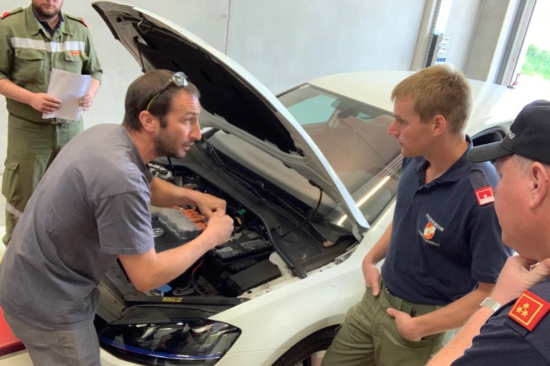 Es ist für die Feuerwehr eine Herausforderung, dass die Hochspannungsbatterie (ca. 350 bis 700 Volt) immer unter Spannung steht und man sie nicht abschalten kann. Man kann die Kabel trennen, aber auch hier unterscheiden sich von Hersteller zu Hersteller die Systeme. Dass es dafür keine einheitliche Norm gibt, bereitet den Einsatzkräften zusätzlich Probleme. Daher ist es besonders wichtig an verschiedensten Fahrzeugen Erfahrungen sammeln zu können.