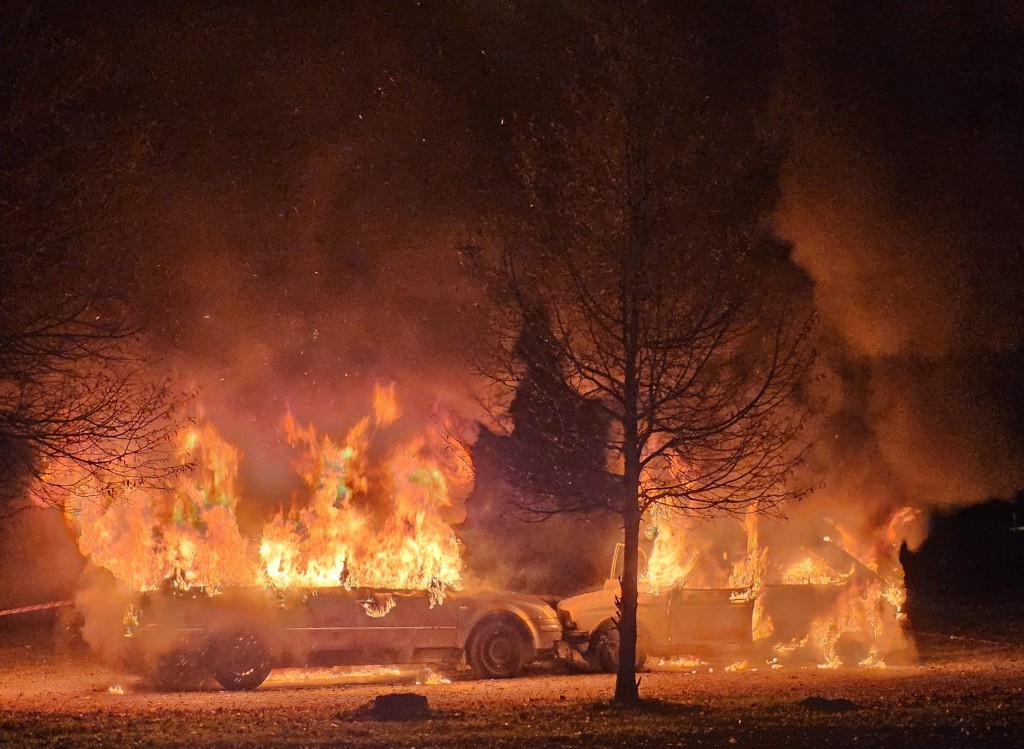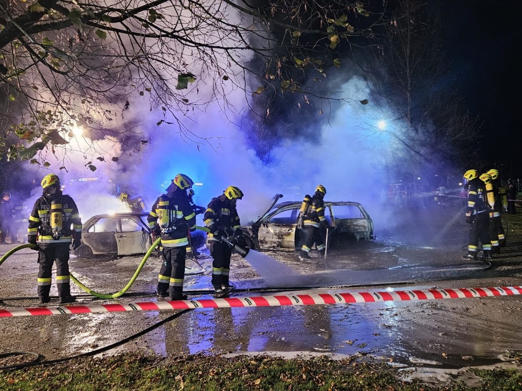 Unerwartete Zusatzherausforderung: Noch während der Aufräumarbeiten kam es zu einer weiteren Alarmierung: Im nahegelegenen Freizeitpark standen mehrere Fahrzeuge in Vollbrand. Sofort rückten die bereits beanspruchten Kräfte erneut aus, und Atemschutztrupps begannen umgehend mit dem Löschangriff.