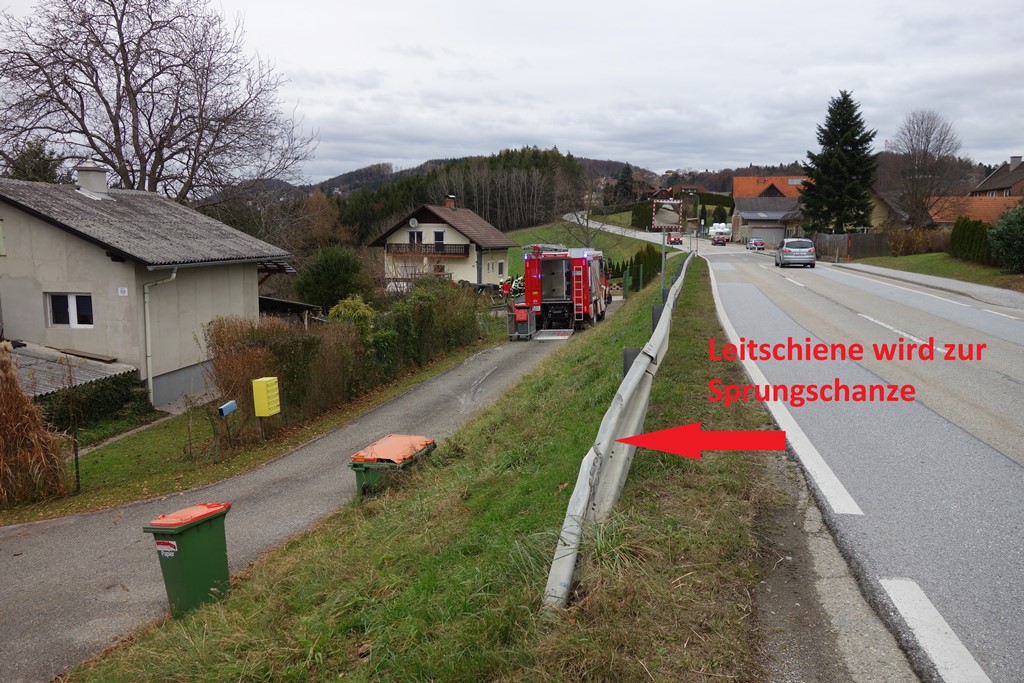 Am Einsatzort angekommen ergab sich folgende Lage: Ein PKW ist auf die Gegenfahrbahn gekommen und auf eine Leitschiene aufgefahren. Diese wirkte dabei wie eine Sprungschanze. Das Auto stürzte auf die darunter liegende Straße und blieb erst nach über 60 Metern vor einem Haus auf dem Dach liegen. Dabei durchschlug das Fahrzeug auch die Gartenzäune von 2 Grundstücken. Laut Auskunft des Fahrzeuglenkers überschlug sich der PKW dabei mehrmals. Der Lenker konnte sich selbst aus dem Wrack befreien und wartete vor dem Haus sitzend auf die Einsatzkräfte. Er wurde sofort von unseren Feuerwehrsanitätern bis zum Eintreffen des First Responder bzw. Rettung betreut. Nach der Erhebung durch die Polizei wurde der Lenker zur weiteren Abklärung vom Roten Kreuz ins Krankenhaus gebracht.